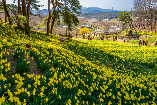 진주 월아산 숲속의진주에서 샛노란 수선화와 벚꽃의 환상적인 풍광을 즐겨보세요.