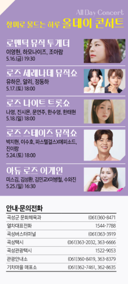 곡성세계장미축제는 5월 15일부터 10일에 걸쳐 펼쳐집니다. 주말에 열리는 인기가수 공연을 포함한 다양한 공연과 이벤트가 화려하게 핀 장미와 함께 축제장을 찾은 방문객의 눈과 귀를 사로잡을 예정입니다.